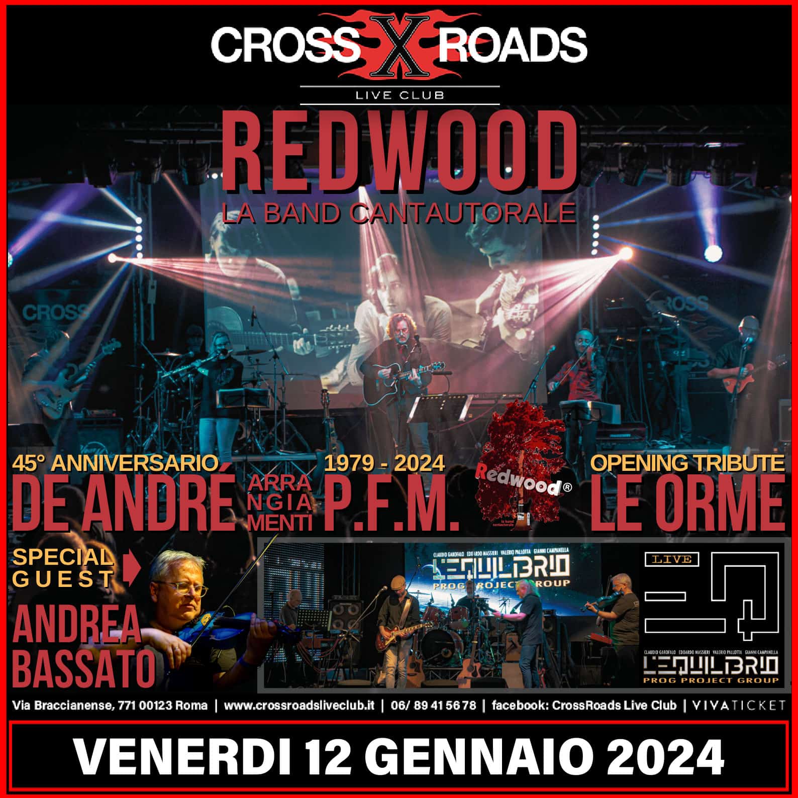 Esattamente 45 anni dopo REDWOOD la band cantautorale eseguirà integralmente i due album che documentano la strepitosa tournée che durante tutto il mese di gennaio del 1979 mise insieme per la prima volta uno dei più grandi cantautori di tutti i tempi e la band rock progressive tra le più importanti a livello mondiale. Un tributo full-band alle poesie in musica del cantautore genovese, con l’energia di un gruppo rock ed il calore del legno di chitarre, mandolino e violino. Canzoni come Bocca di rosa, Via del campo, Un giudice, Amico fragile, Il pescatore…