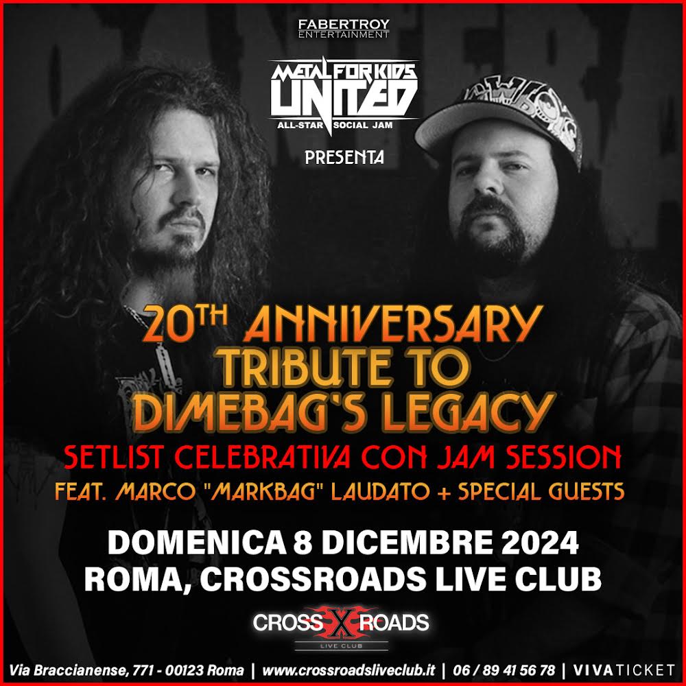 Domenica 8 dicembre 2024, al Crossroads Live Club di Roma torna il METAL FOR KIDS UNITED! con uno spin-off interamente dedicato alla musica e all’incredibile eredità artistica di Dimebag Darell e Vinnie Paul Abbott (chitarrista e batterista fondatori dei Pantera e successivamente dei Damageplan, in occasione del 20° anniversario dalla prematura e tragica scomparsa del talentuoso chitarrista, avvenuta l’8 dicembre 2004 durante un concerto dei Damageplan.