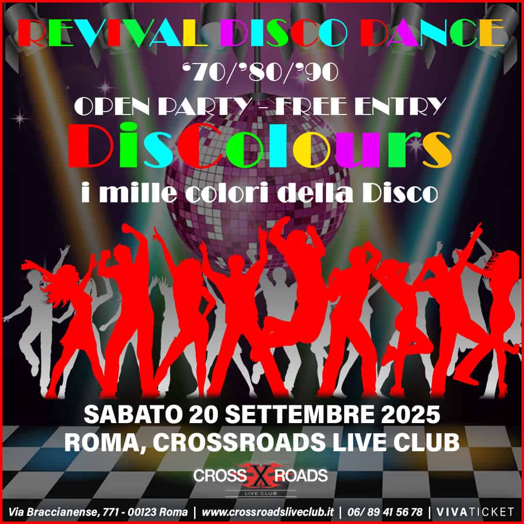 Il 20 Settembre 2025 con una grande party il CrossRoads festeggia l’inizio della diciassettesima stagione. Ormai vero e proprio punto di riferimento in Italia per tutti gli appassionati della buona musica, il CrossRoads offre a tutti gli amici l’ingresso gratuito alla propria festa con tanta musica Disco Dance, si ballerà dunque per festeggiare tutti insieme. Si comincia alle ore 20:00 con l’apertura delle porte, prenotazione tavoli vivamente consigliata fino ad esaurimento posti. I Discolours Band che ci faranno rivivere le migliori hits degli anni ’70/’80/’90 che hanno appassionato e fatto ballare un’intera generazione. La scaletta ideale di qualsiasi appassionato del genere, un misto di rock, dance e pop di qualità, con sonorità rigorosamente fedeli agli originali.